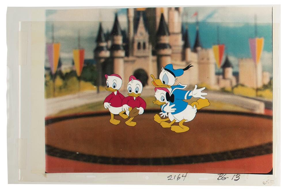 (Walt Disney Studios, 1955) Original production cel featuring Donald Duck and his nephews Huey, Dewey, and Louie from the Disneyland TV Show. The cel is placed on a color copy background. Images measure 3.5 x 4.25 (Donald and nephew) and 2.75 x 3 (two nephews), with overall dimensions of 17 x 11. In fine condition.