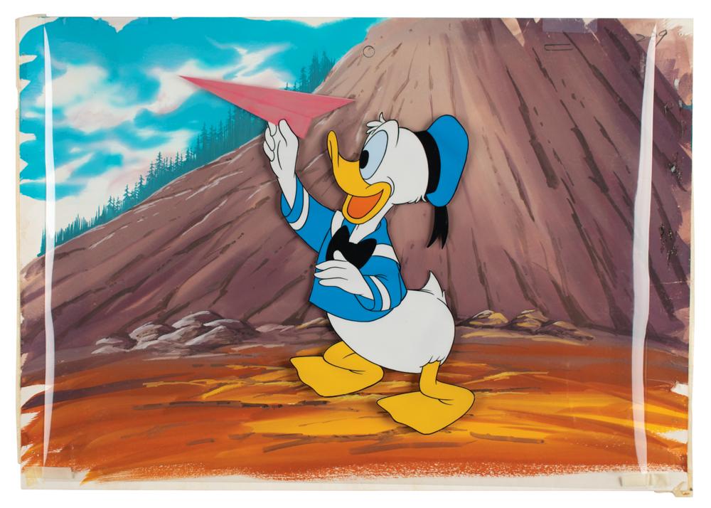 (Walt Disney Studios, 1956) Original production cel featuring Donald Duck from the Disneyland TV Show, showing him holding a paper airplane. The cel is placed on a circa 1980s hand-painted background from another studio. Image measures 6.5 x 7.5, with overall dimensions of 14.25 x 10. In fine condition.