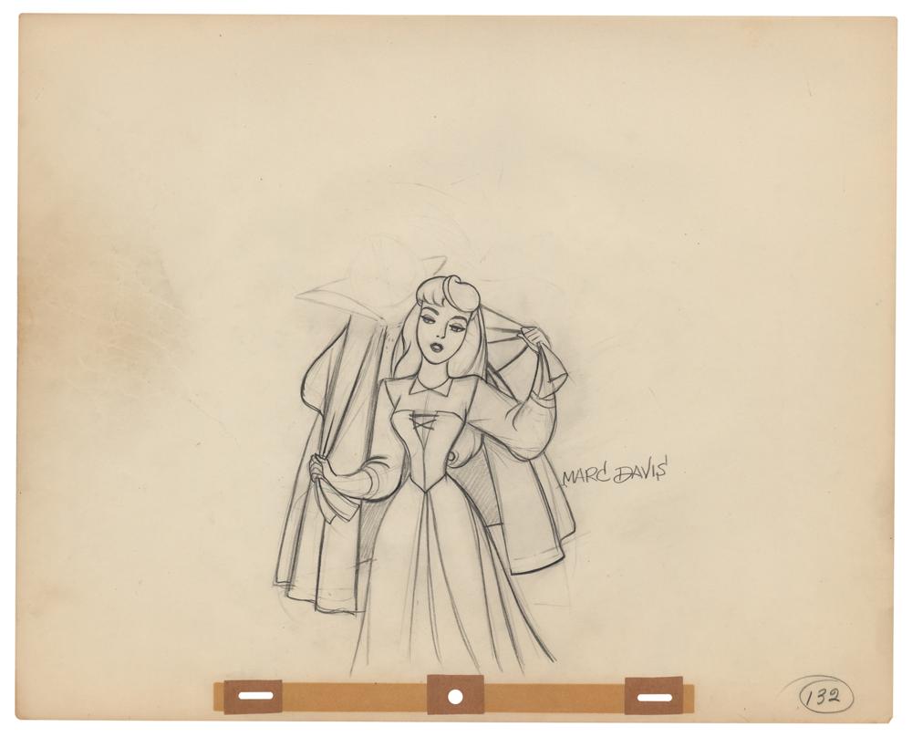 (Walt Disney Studios, 1959) Detailed original production drawing featuring Briar Rose from Sleeping Beauty, signed on the right side in pencil by the animator, "Marc Davis." Accomplished in graphite on untrimmed 15.5 x 12.5 animation paper, marked "231" in the lower right corner. Image measures 5.25 x 7. In fine condition. One of Disney's so-called 'Nine Old Men,' Davis served as a directing animator for Sleeping Beauty.
