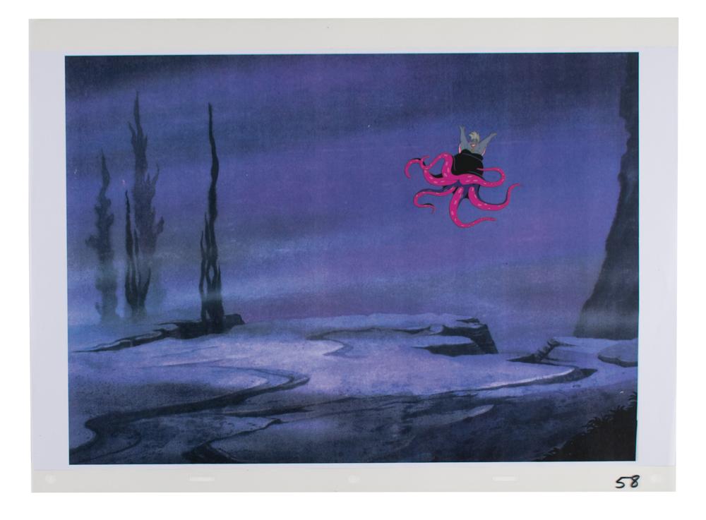 (Walt Disney Studios, 1989) Original production cel featuring Ursula from The Little Mermaid, showing the half-woman, half-octopus antagonist in a full-bodied underwater pose. The cel is placed on a color copy background. Image measures 3 x 2.75, with overall dimensions of 17 x 12.5. In fine condition.
