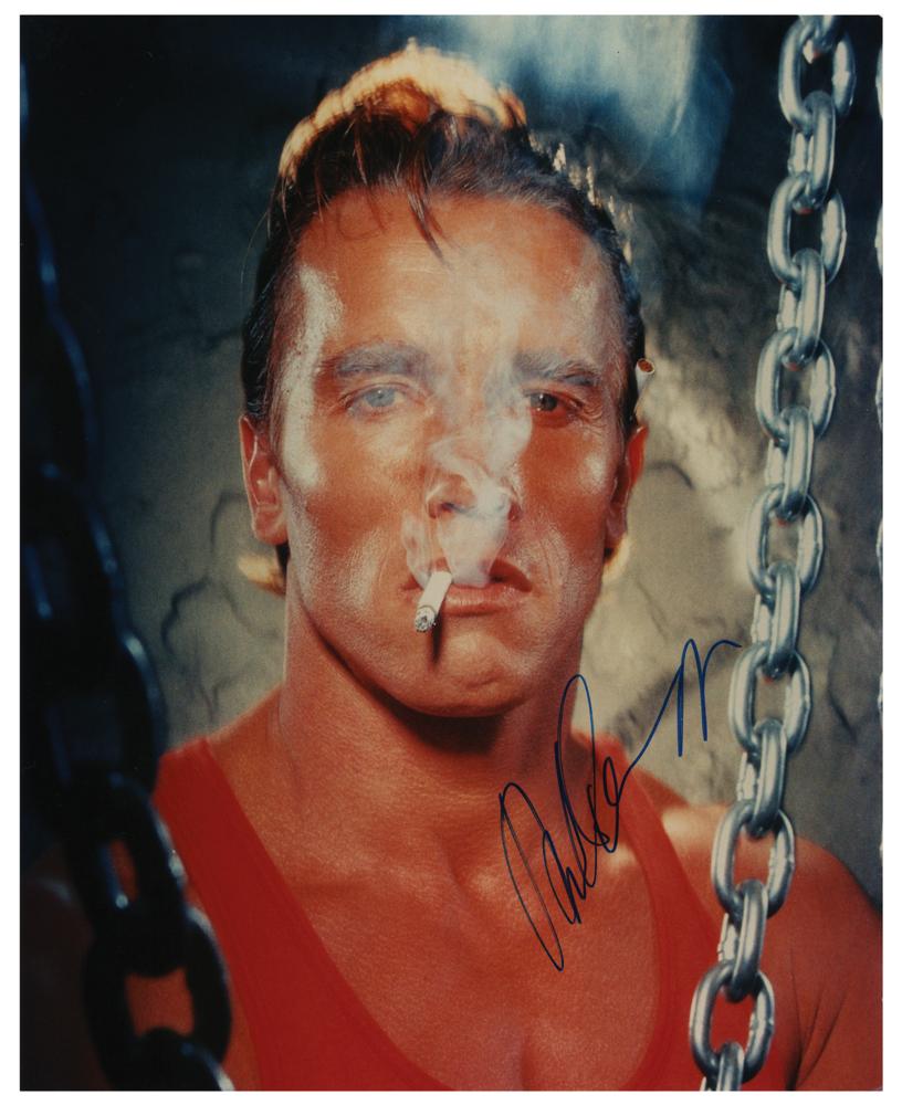 Totally awesome color glossy 8 x 10 close-up photo of Arnold Schwarzenegger surrounded by chains and smoking a cigarette, signed in blue felt tip. In very fine condition.