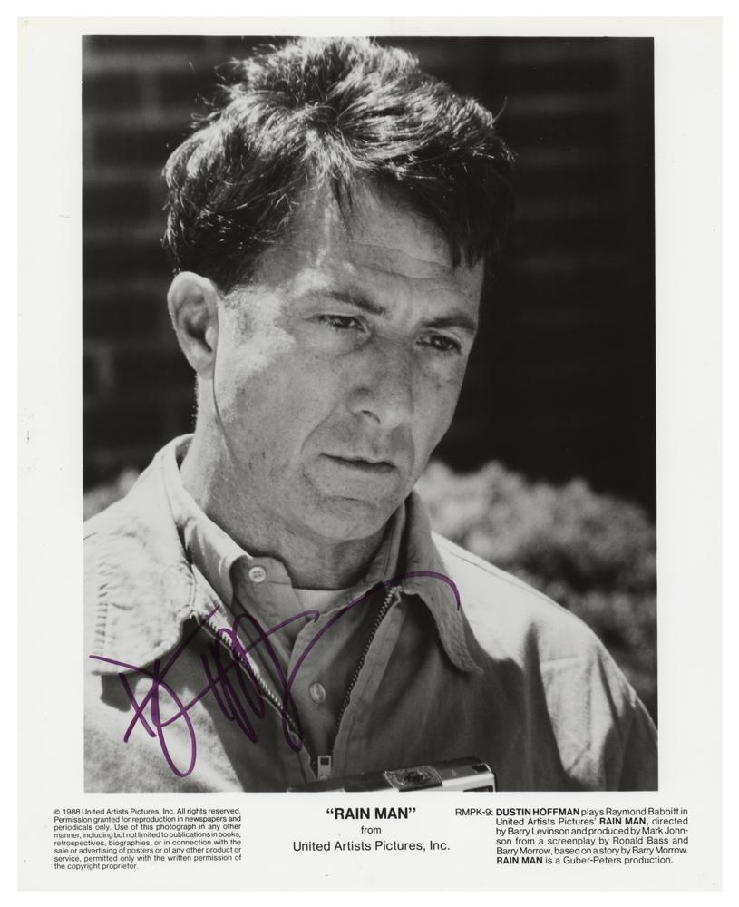 Glossy 8 x 10 United Artists Pictures publicity photo of Dustin Hoffman in his Oscar-winning role as Ray Babbitt for the 1988 film Rain Man, signed in purple felt tip. In fine condition, with a small surface dent in Hoffman's hair.
