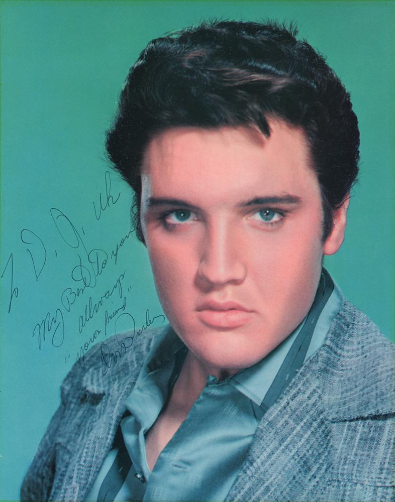 Superb vintage color 9.75 x 12 head-and-shoulders promotional photo of Elvis for the 1957 film Jailhouse Rock, signed and inscribed in blue ballpoint, "To D. J. uh, My best to you always, 'your friend,' Elvis Presley." Affixed to a slightly larger cardstock mount. In fine condition, with moderate contrast to his first name over his checked jacket, and toning from prior display.
