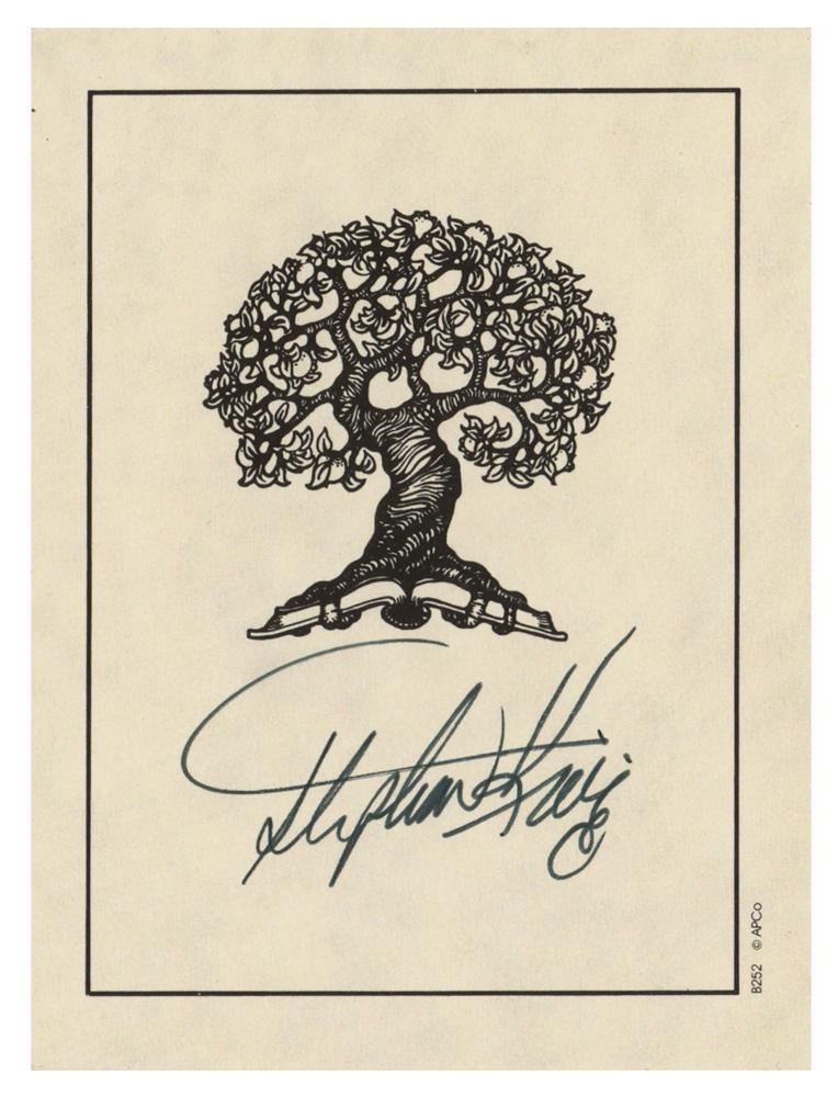 Felt tip signature, "Stephen King,” on an off-white 3 x 4 arboreal bookplate. In very fine condition.