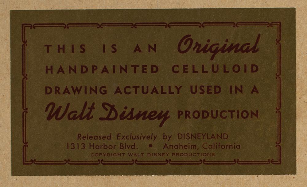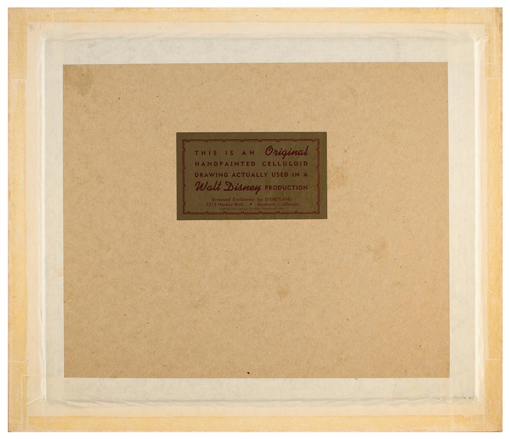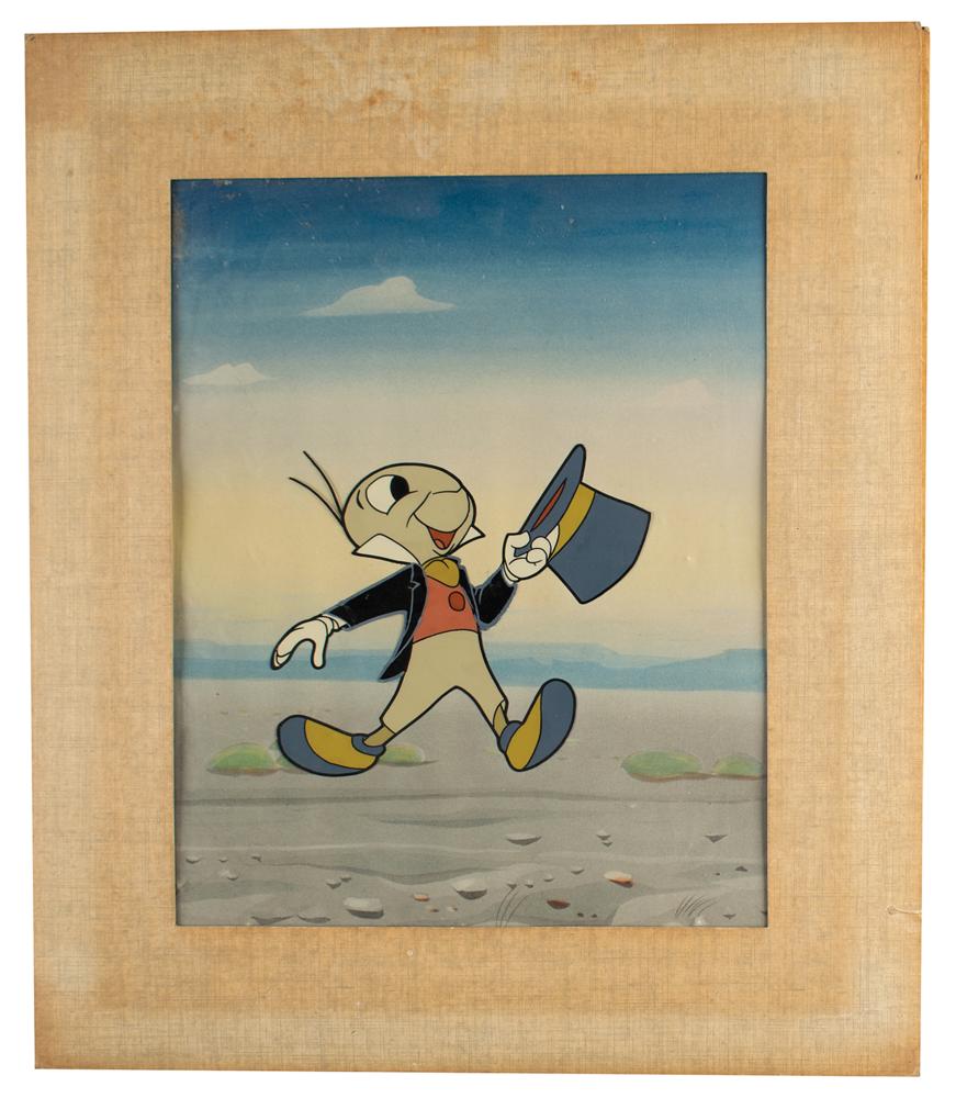 (Walt Disney Studios, 1955) Original production cel of Jiminy Cricket from an episode of the Mickey Mouse Club, which depicts the helpful insect holding his top hat in a large full-length pose. The cel is placed on a matching production background. Image measures 5 x 4.5, with a mat opening of 8 x 10. Originally sold at the Art Corner in Disneyland, the cel is displayed in its original 12 x 14 mat, with the backing featuring an affixed gold Walt Disney Productions label, which reads: "This Is an Original Handpainted Celluloid Drawing Actually Used in a Walt Disney Production." In fine condition, with some small area of lifting paint to his jacket, which also features light feathering to its gray outline; the mat bears some toning and stains.