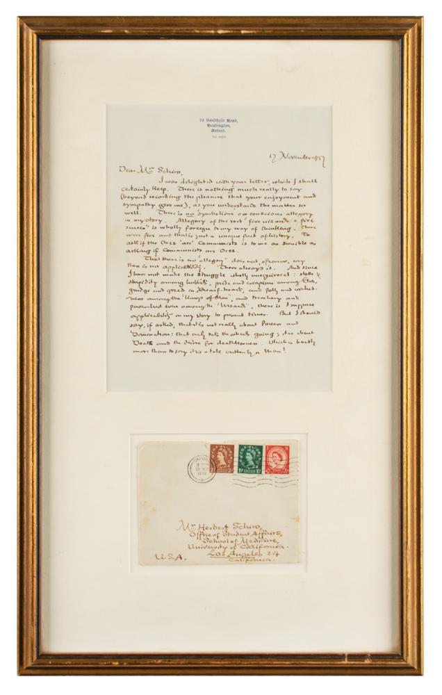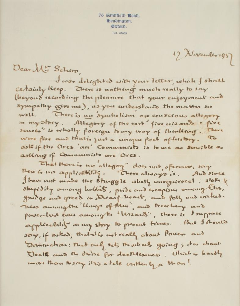 Magnificent ALS from J. R. R. Tolkien, one page both sides, 6.75 x 8.5, personal 76 Sandfield Road, Headington, Oxford letterhead, November 17, 1957. Handwritten letter to Herbert Schiro of the School of Medicine at the University of California, in full: "I was delighted with your letter, which I shall certainly keep. There is nothing much really to say (beyond recording the pleasure that your enjoyment and sympathy give me), as you understand the matter so well. There is no ‘symbolism’ or conscious allegory in my story. Allegory of the sort ‘five wizards = five senses’ is wholly foreign to my way of thinking. There were five wizards and that is just a unique part of history. To ask if the Orcs ‘are’ Communists is to me as sensible as asking if Communists are Orcs.
