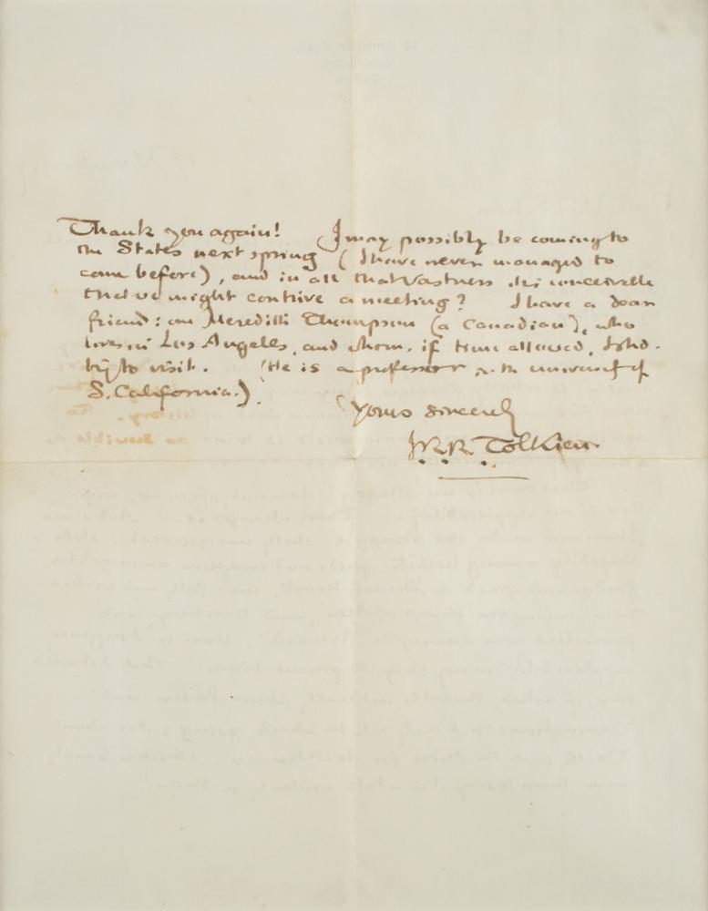 Thank you again! I may possibly be coming to the States next spring (I have never managed to come before), and in all that vastness it is conceivable that we might contrive a meeting? I have a dear friend: one Meredith Thompson (a Canadian), who lives in Los Angeles, and whom, if time allowed, I shd try to visit. (He is a professor in the University of S. California).” Matted and framed with Tolkien's original hand-addressed mailing envelope to an overall size of 12 x 19.75; the frame's glass backing allows viewing for the second page. In fine condition.