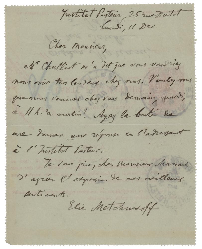 Russian biologist and zoologist (1845-1916) best known for his pioneering research into the immune system, for which he was awarded the 1908 Nobel Prize in Physiology or Medicine. Untranslated ALS in French, one page, 4.25 x 5.5, postmarked December 11, 1905. Addressed from the Pasteur Institute, a handwritten letter to Monsieur Mariani. In fine condition.