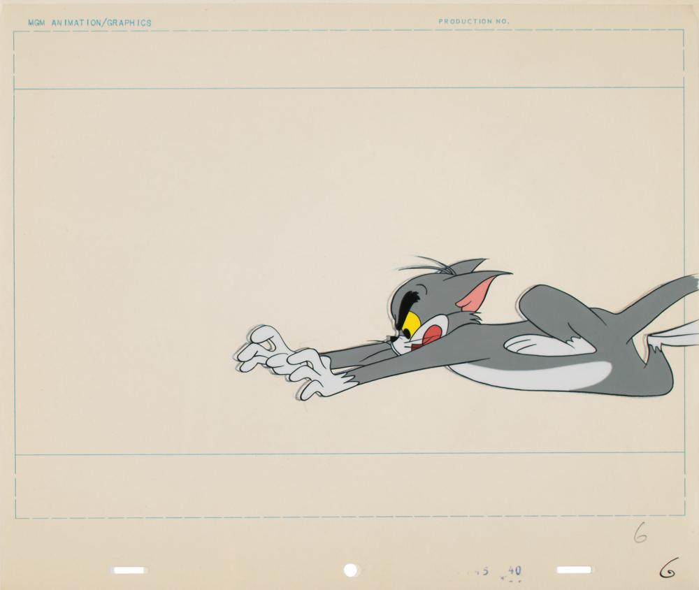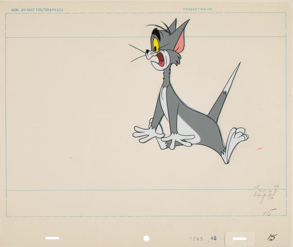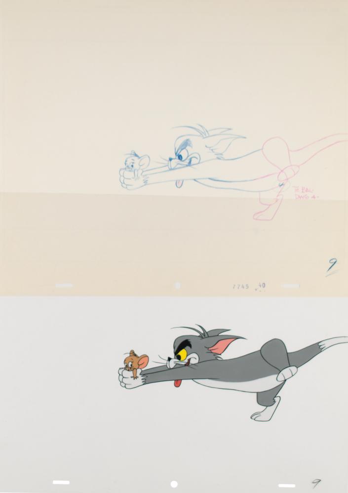 (MGM Animation, 1960s) Scarce running series of 10 original production cels and their original matching drawings of Tom and Jerry from an unidentified episode of Tom and Jerry. The cels combine to create a brief animated sequence that depicts Tom, his tongue lolling hungrily from his mouth, chasing and grabbing Jerry, who eventually pops free when Tom hits the brakes in a moment of fright. Marked in succession from ?6? to ?15,? each of the 10 cels and untrimmed animation sheets measure 12.5 x 10.5, and all are marked along the bottom in identical fashion: ?7745 40.? The Tom images range in size from 4 x 8.25 to 7 x 8.75, and Jerry, who is visible in eight of the 10 cels and drawings, measures approximately 1 x 1. In overall fine condition.