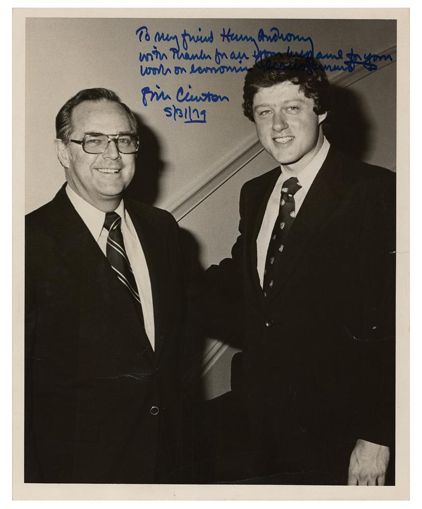 Vintage glossy 8 x 10 photo of Clinton with William Henry Anthony, Sr., signed and inscribed in blue felt tip, "To my friend Henry Anthony, with thanks for all your help and for your work on economic development, Bill Clinton, 5/31/79.” In very good condition, with overall creasing and ripping, light silvering to the darker areas of the image, and a short tear to the right edge.