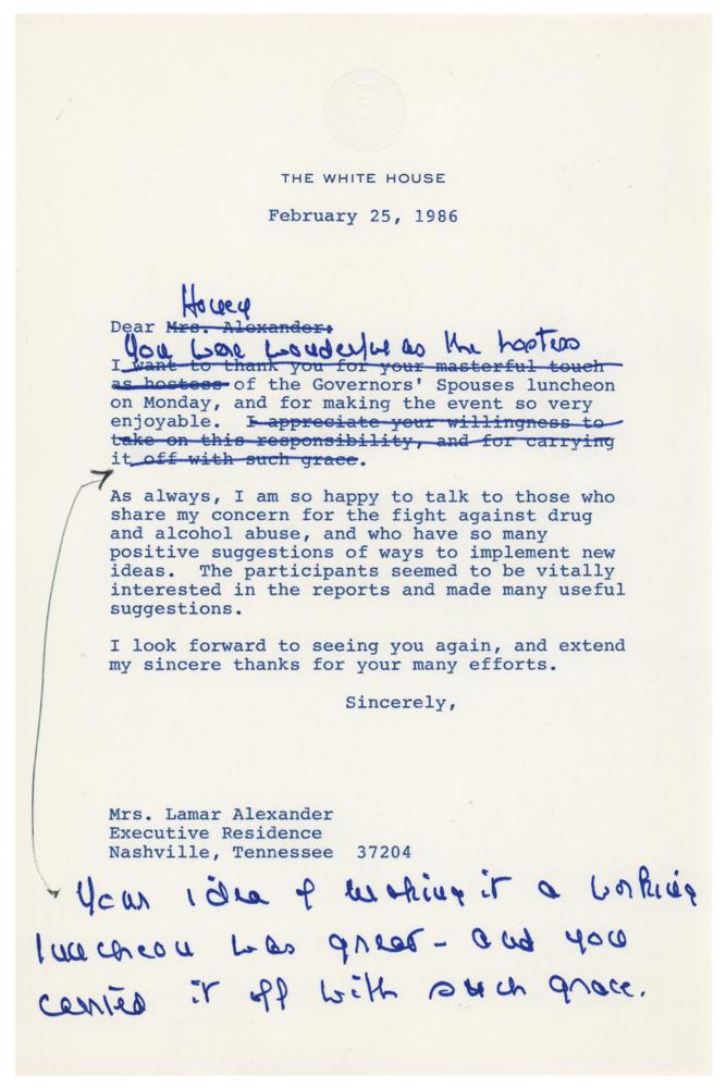 Hand-annotated letter draft as first lady, one page, 6.25 x 9.5, White House letterhead, February 25, 1986. Draft of a letter to Leslee 'Honey' Alexander, the wife of Tennessee Governor Lamar Alexander. Reagan crosses out the formal greeting and replaces it with "Honey," and makes extensive revisions to the first paragraph in blue felt tip (indicated by parentheses in the transcript). In full: "(You were wonderful as the hostess) of the Governors' Spouses luncheon on Monday, and for making the event so very enjoyable. (Your idea of making it a working luncheon was great—and you carried it off with such grace). As always, I am so happy to talk to those who share my concern for the fight against drug and alcohol abuse, and who have so many positive suggestions of ways to implement new ideas." In very fine condition.