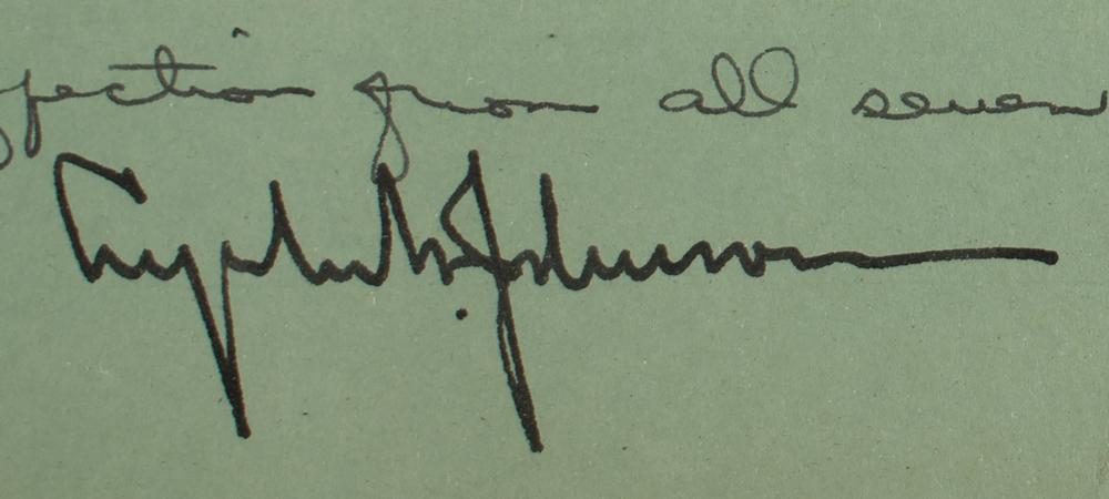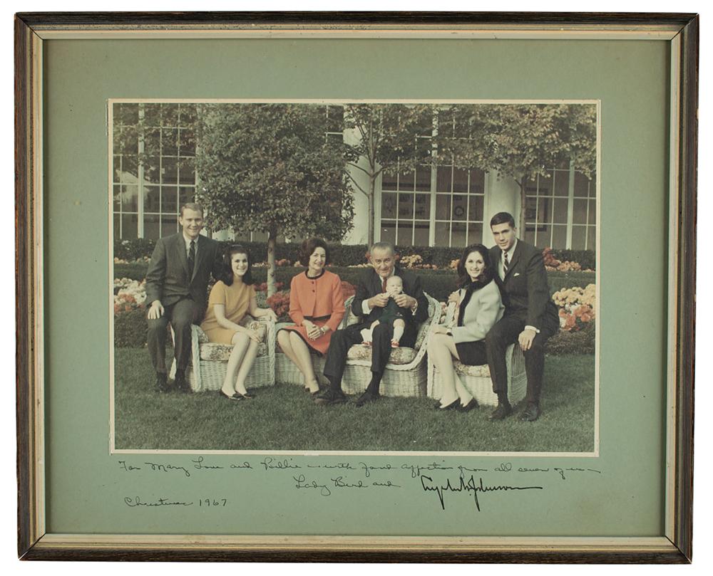 Color glossy 11.5 x 8.25 photo of the Johnson family outside the White House, affixed to its original 14.75 x 11.75 mount, signed and inscribed on the mount in black ink, "For Mary Lou and Billie—with fond affection from all seven of us—Lady Bird Johnson, Christmas 1967" and "Lyndon B. Johnson.” Framed and in fine condition.
