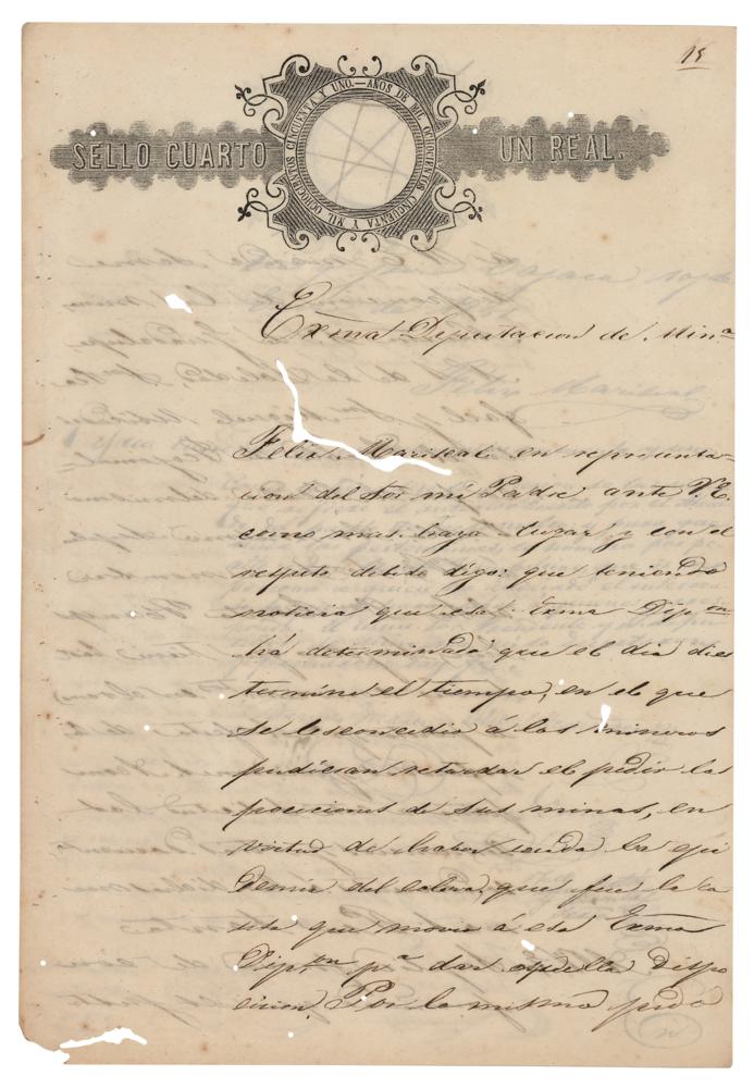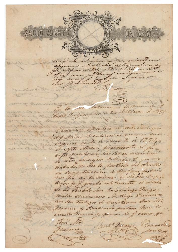 Indigenous Mexican statesman (1806-1872) who served as the country's president from 1858 until his death. Manuscript DS, in Spanish, four pages on two adjoining sheets, 8.5 x 12.5, January 1851. Untranslated document signed at the conclusion by Juarez during his first term as Governor of Oaxaca. In very good to fine condition, with small binding holes along the left edge, and areas of insect damage slightly affecting some text, but not the signature.