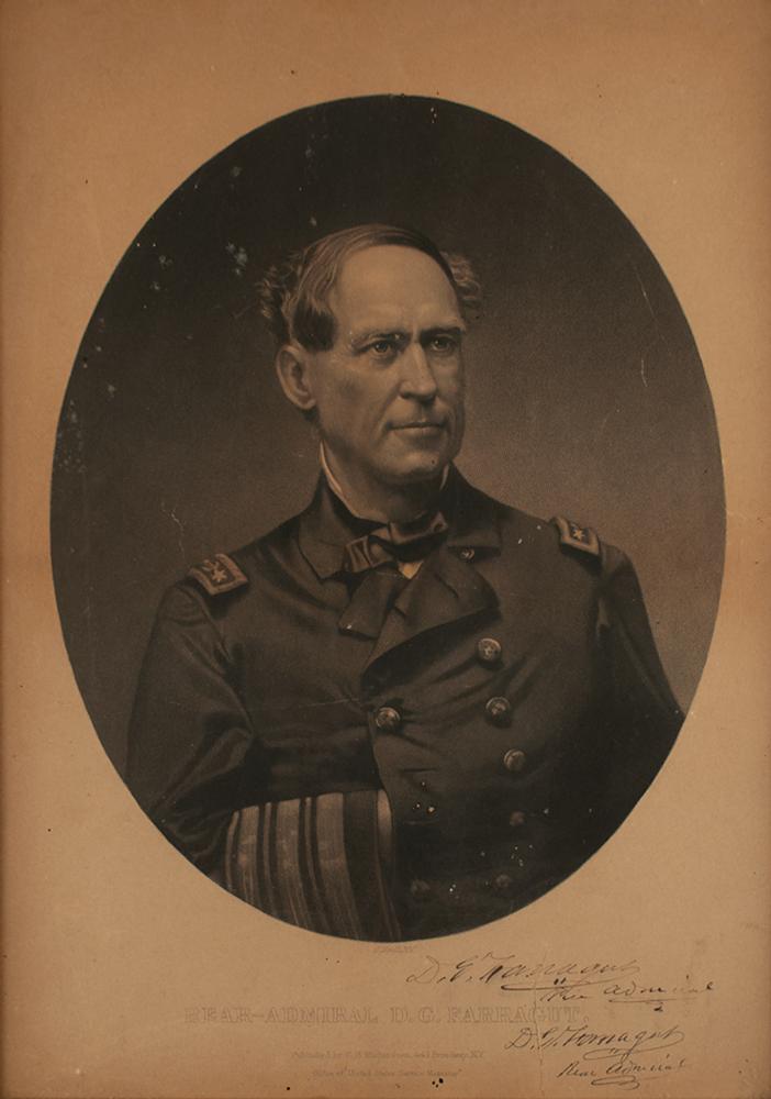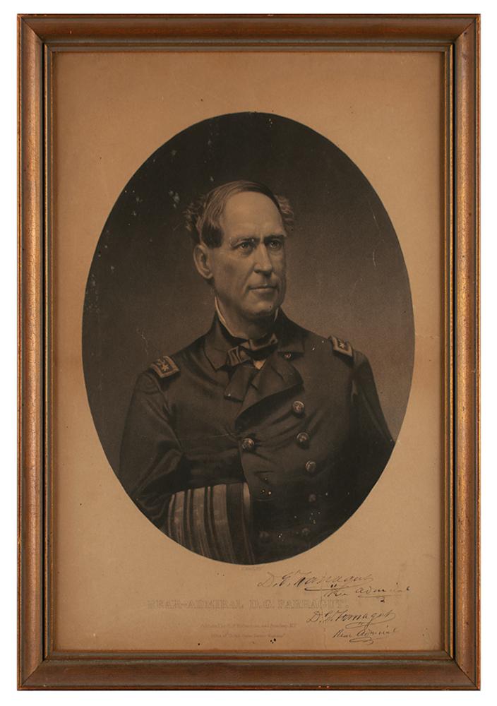 American admiral (1801-1870) who was a flag officer of the Navy during the Civil War. Scarce oversized 11 x 15.75 print of Rear-Admiral David G. Farragut in uniform, published by C. B. Richardson, signed in the lower right in ink, "D. G. Farragut, Rear Admiral." Also bears a facsimile signature. Framed to an overall size of 13 x 17.5; a label on the reverse reads: "Property of J. A. E. S. Brainard, belonged to Gideon Welles." In very good to fine condition, with two edge tears, one of which passes through Farragut's last name.