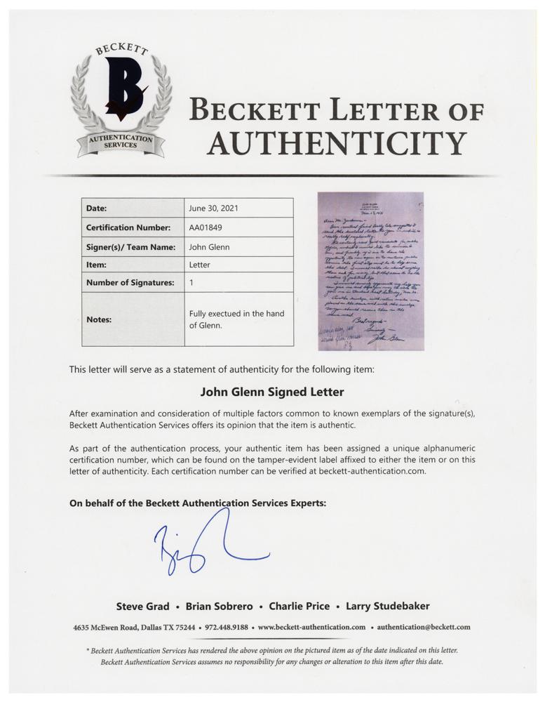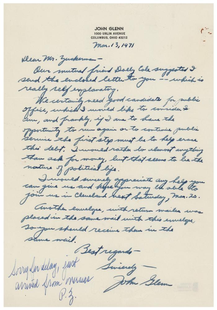 ALS, one page, 7.25 x 10.5, personal letterhead, March 13, 1971. Handwritten letter to "Mr. Zuckerman," in part: "We certainly need a good candidate for public office, which I would like to consider I am, and frankly, if I am to have the opportunity to run again or to continue public service the first step must be to help erase this debt. I would rather do almost anything than ask for money, but that seems to be the nature of political life. I would sincerely appreciate any help you can give us and the hope you may be able to join us in Cleveland next Saturday, Mar. 20." In fine condition. Accompanied by a full letter of authenticity from Beckett Authentication Services. Glenn had campaigned for one of Ohio's Senate seats in 1964 and 1970, but never made it past the primary stage. He would run again and win in 1974, serving in the US Senate for 25 years.
