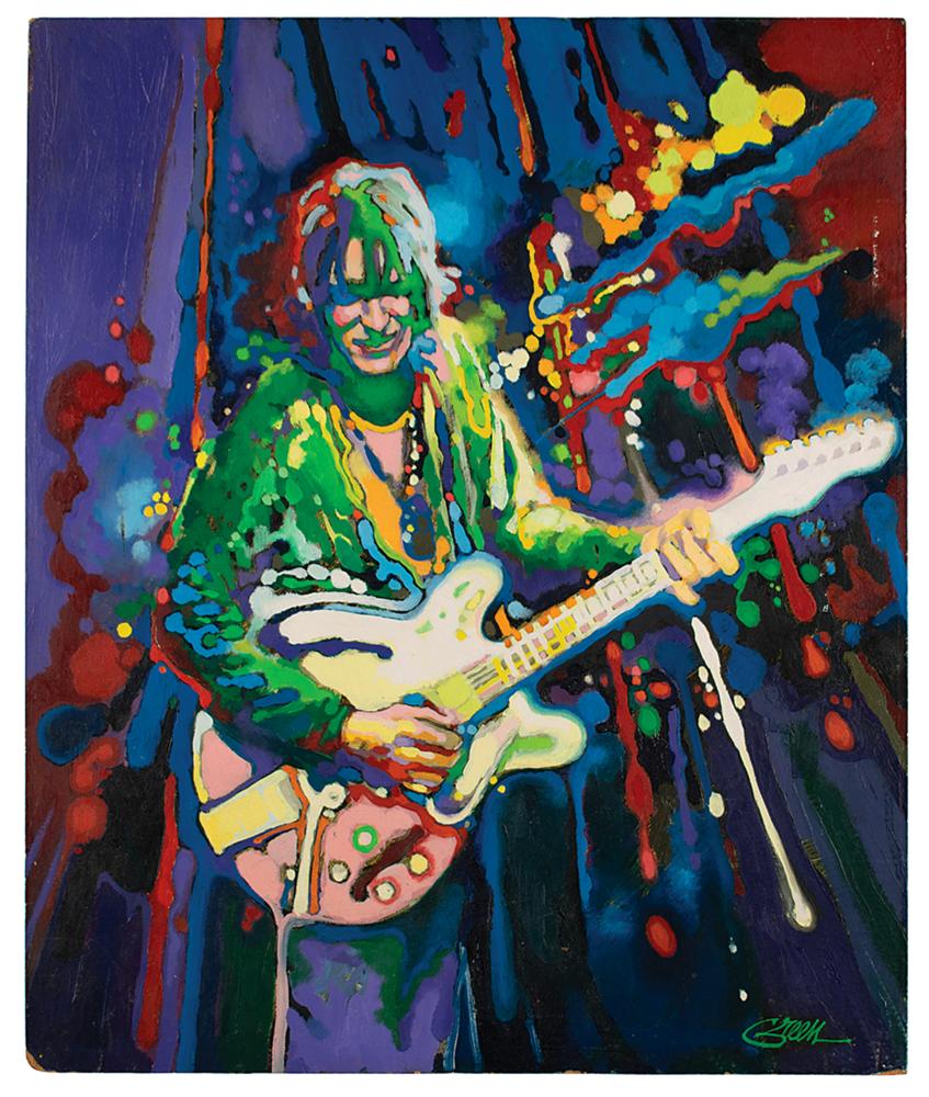 Colorful original 16 x 19.25 painting of Ten Years After's Alvin Lee, accomplished in acrylic on artist's board by California illustrator Peter Green, signed in the lower right corner in paint by the artist, "Green." This artwork appeared on the cover of Rock Chord Guide by Harvey Vinson, published in 1970 by Amsco. In fine condition, with wear to corners and edges.