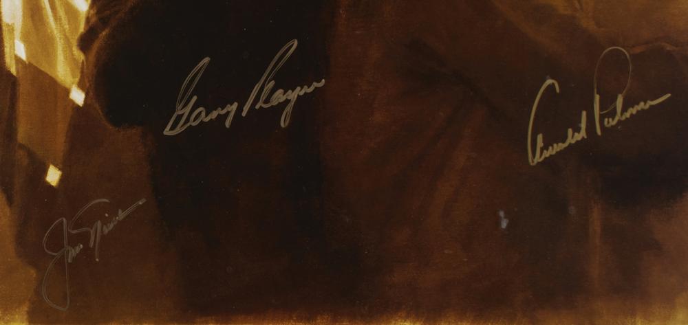 Impressive 31 x 25 print from the 2003 Gary Player Invitational entitled 'The Big Three,' signed in gold ink by Arnold Palmer, Jack Nicklaus, and Gary Player. Double-matted and framed to an overall size of 38 x 32. In fine condition.