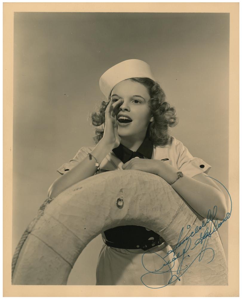 Vintage circa 1938 matte-finish 8 x 10 photo of Garland wearing a sailor ensemble and leaning on a lifebuoy, signed in fountain pen, "Sincerely, Judy Garland." In very fine condition, with one tiny crease touching Garland's waist.