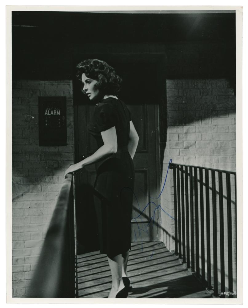 Exceptional glossy 8 x 10 photo of Elizabeth Taylor in the classic 1959 film Suddenly, Last Summer, signed in blue ink. In fine condition, with subtle spotting to the emulsion. Based on the Tennessee Williams play by the same name, the film featured an exceptional cast-Katharine Hepburn and Montgomery Clift also co-starred, and both Taylor and Hepburn received nominations for the Academy Award for Best Actress. Neither of them won the Oscar, but Taylor did receive a Golden Globe for her memorable performance.