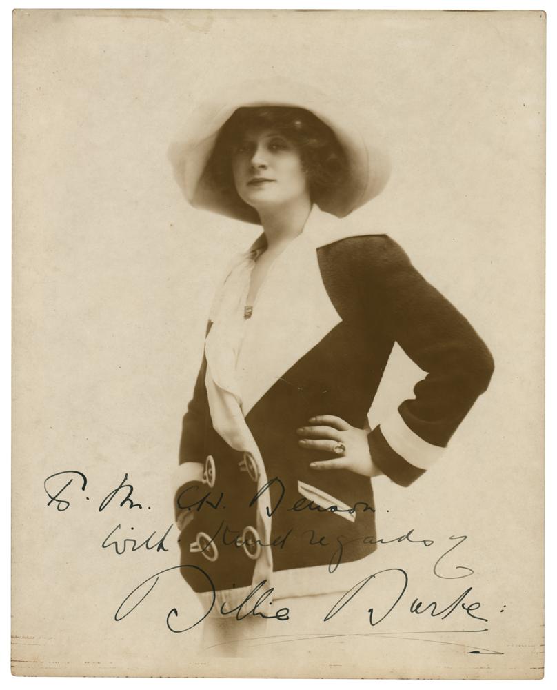 Vintage pearl-finish 8 x 10 photo of Burke with one hand on her hip and the other in her pocket, signed and inscribed in fountain pen, "?with kind regards of Billie Burke.” In fine condition, with some light edge staining.