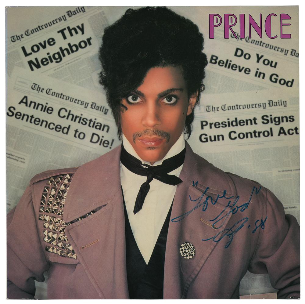 Controversy album by Prince, signed on the front cover in blue felt tip, "'Love God,' Prince '88." In fine condition, with a few scattered light edge creases. The record is included.