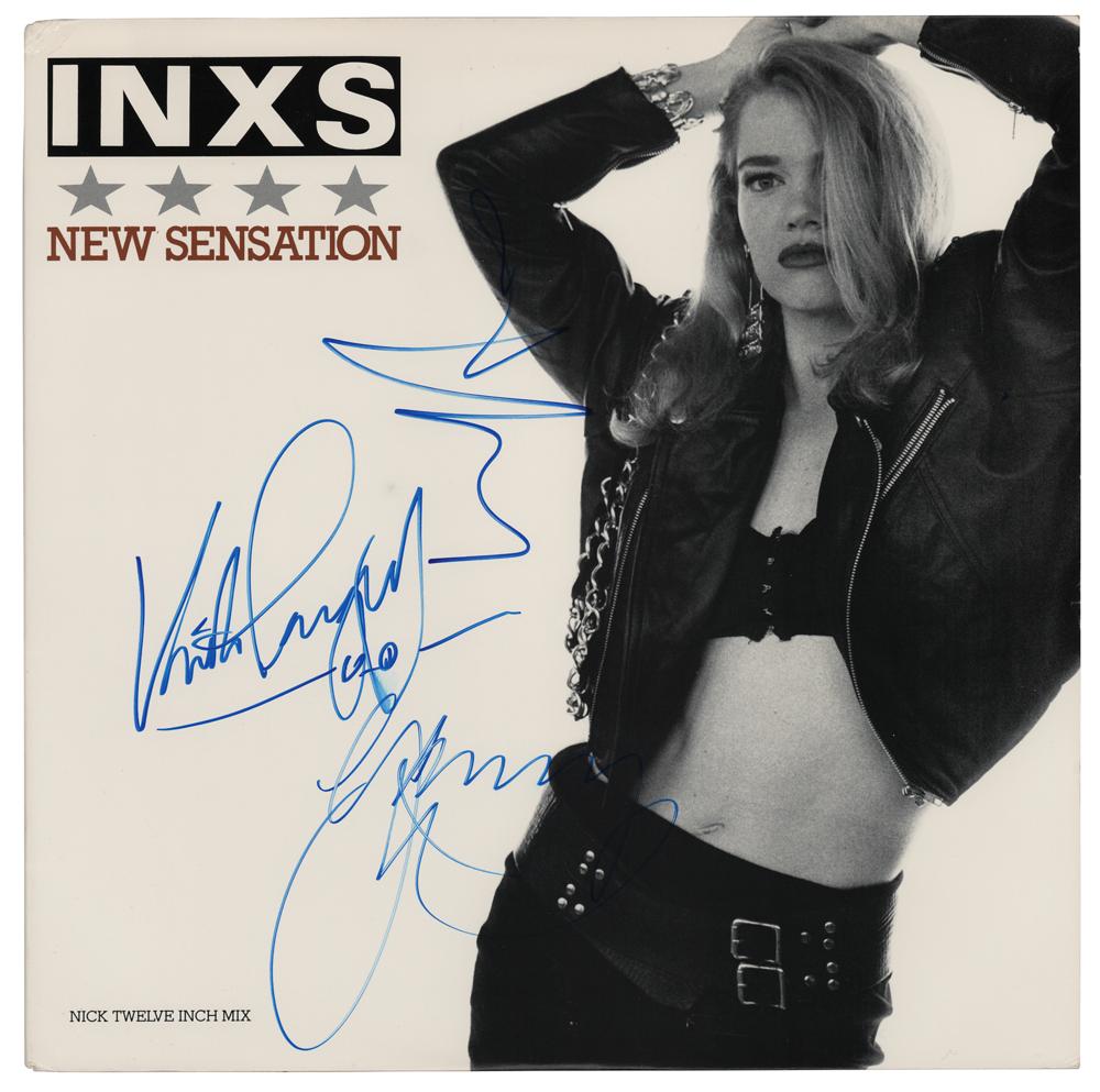 'New Sensation' single album by INXS, signed on the front cover in blue felt tip by Michael Hutchence, Kirk Pengilly, and Garry Gary Beers. In fine condition. The record is included.