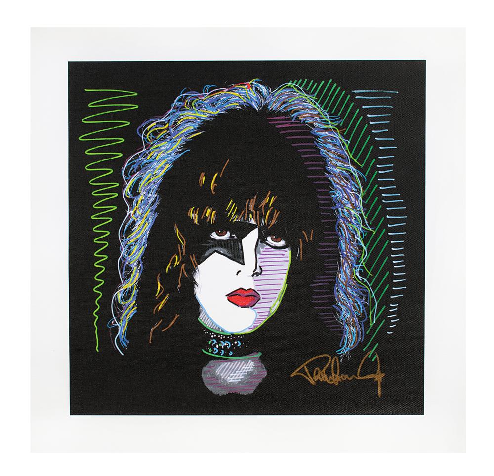 Appealing color 14.75 x 14.75 canvas print of a self-portrait painting of Paul Stanley, depicting himself in full makeup as The Starchild from KISS, signed in gold ink. In very fine condition.