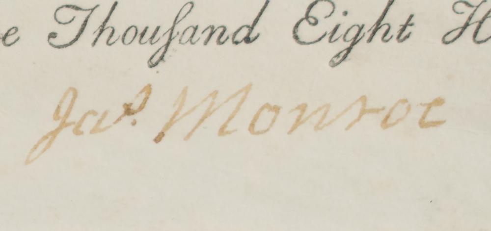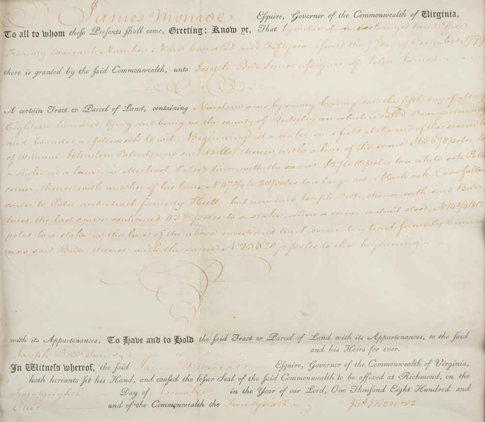 Partly-printed vellum DS, signed “Jas. Monroe,” one page, 12.5 x 11, November 28, 1801. As governor of Virginia, Monroe grants unto Joseph Bell, Sr., a "certain Tract or Parcel of Land, containing Nineteen acres?in the country of Berkeley on what is called Beargarden ridge." Neatly signed at the conclusion by Governor Monroe. Nicely matted with an engraved portrait and framed to an overall size of 26 x 16.5. In fine condition, with all handwriting, including the signature, a couple of shades light.