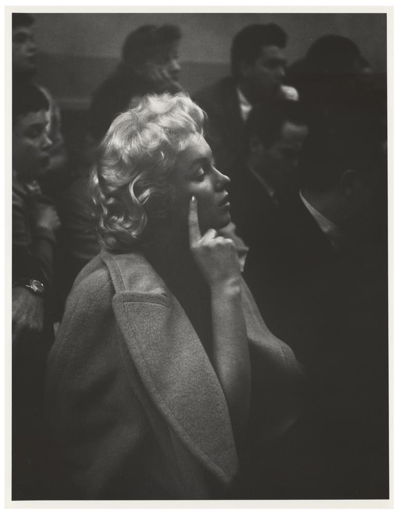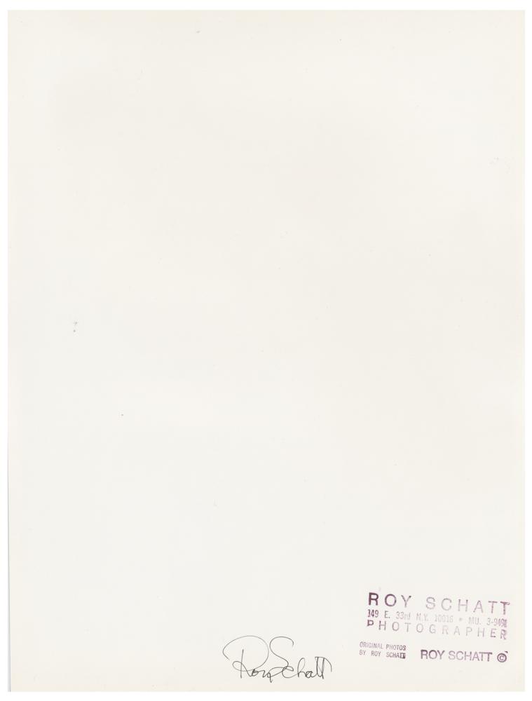 Original semi-glossy 11 x 14 silver gelatin photo of Marilyn Monroe at the Actors Studio in 1955, signed on the reverse in ink by the photographer, "Roy Schatt." Reverse also bears Roy Schatt credit stamps. In fine condition, with a crease to the lower left corner.