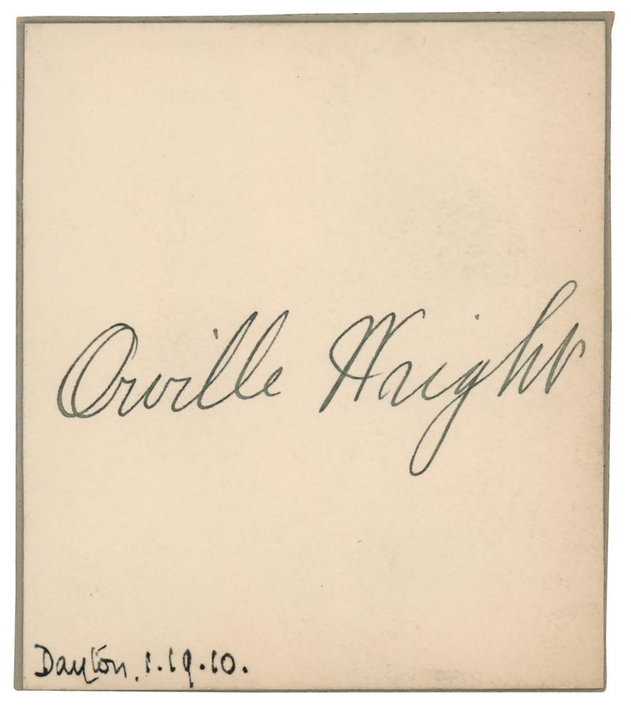 Neat fountain pen signature, "Orville Wright,” on an off-white 3.75 x 3 card, annotated along the bottom in another hand: "Dayton, 1.19.10." In fine condition.