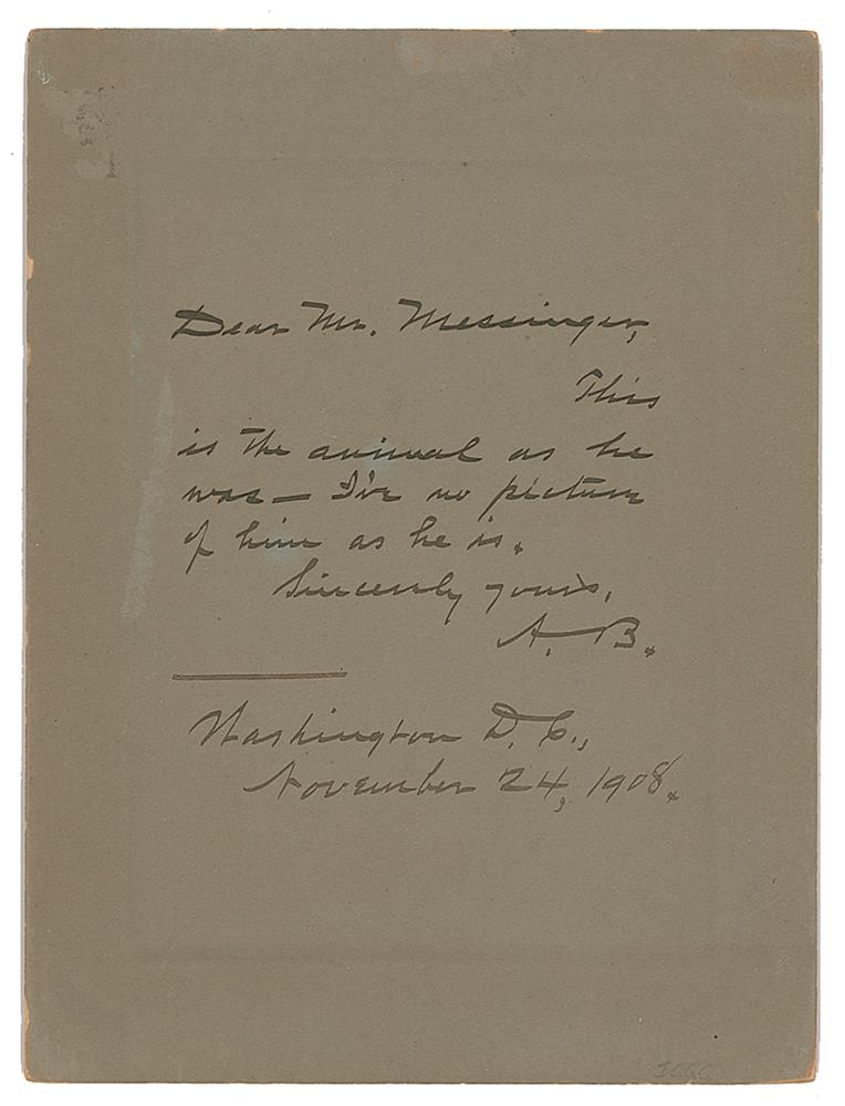 American writer (1842-c.1914) best known for his vivid short stories (including the classic 'An Occurrence at Owl Creek Bridge') and his satirical 'The Devil's Dictionary.' In 1913, while traveling with Pancho Villa's troops during the Mexican Revolution, Bierce disappeared; his ultimate fate remains a mystery. Rare matte-finish 4 x 5.5 photo of the author by Prince of Washington, D.C., affixed to its original 6 x 8 mount, signed on the mount in ink, "Ambrose Bierce—1896," and signed and inscribed on the reverse, "Dear Mr. Messinger, This is the animal as he was—I've no picture of him as he is. Sincerely yours, A.B., Washington, D., November 24, 1908." In fine condition, with a few light scuffs on the reverse. Bierce is extremely rare in signed photos, this being an extraordinary example.