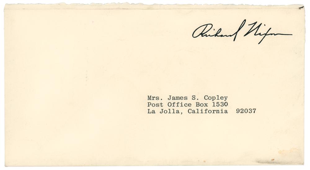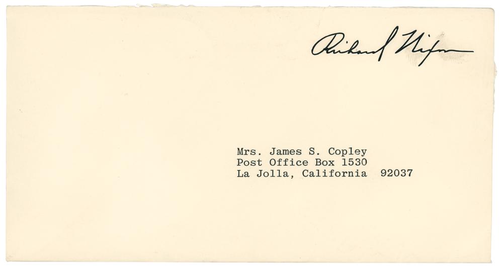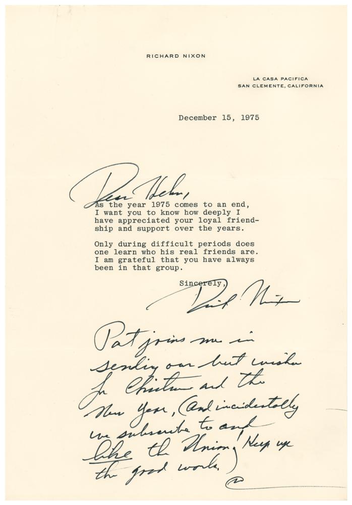 Two TLSs, both signed, "Dick Nixon," each one page, 7.25 x 10.5, personal letterhead. Both letters are to Helen Copley, the widow of newspaper publisher James S. Copley, with Nixon adding the greeting in his own hand, as well as a postscript to each letter. The first letter, dated December 15, 1975, reads, in full: "As the year 1975 comes to an end, I want you to know how deeply I have appreciated your loyal friendship and support over the years. Only during difficult periods does one learn who his real friends are. I am grateful that you have always been in that group." Nixon's handwritten postscript reads: "Pat joins me in sending our best wishes for Christmas and the New Year, (And incidentally we subscribe to and like the Union. Keep up the good work.) N."