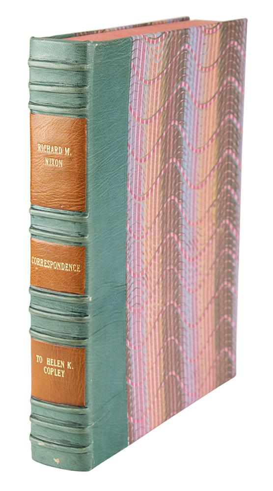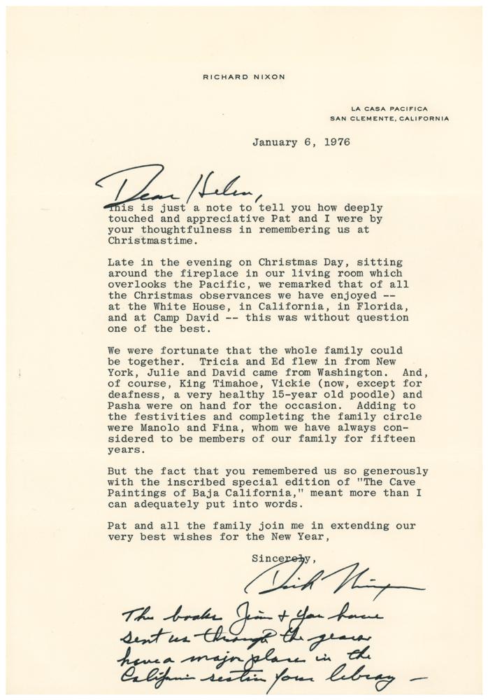 Second letter, dated January 6, 1976, reads, in part: "This is just a note to tell you how deeply touched and appreciative Pat and I were by your thoughtfulness in remembering us at Christmastime. Late in the evening on Christmas Day, sitting around the fireplace in our living room which overlooks the Pacific, we remarked that of all the Christmas observances we have enjoyed-at the White House, in California, in Florida, and at Camp David-this was without question one of the best. We were fortunate that the whole family could be together. Tricia and Ed flew in from New York, Julie and David came from Washington." Postscript at the bottom reads, "The books Jim & you have sent us through the years have a major place in the California section of our library." The letters are housed in a luxurious custom-made clamshell case. In overall fine condition.