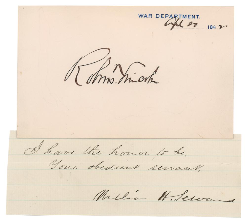 Two items: an ink signature of Robert Todd Lincoln on a 4.75 x 3 War Department card dated to April 20, 1882; and an ink signature of William H. Seward on an off-white 5 x 2 sheet clipped from the close of a letter. In overall fine condition.