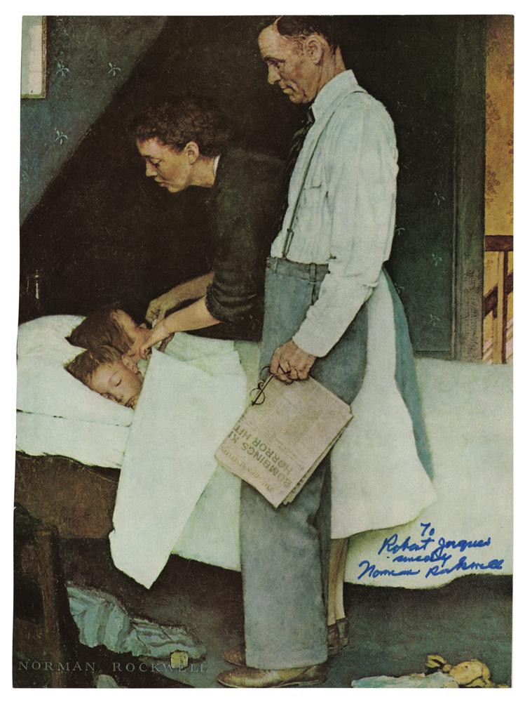 Color 8 x 11 magazine photo of Norman Rockwell's 1943 painting 'Freedom from Fear,' signed and inscribed in black felt tip, "To Robert Jaques. sincerely, Norman Rockwell.” In fine condition, with two light creases to the upper left corner, and some small surface impressions from the clasp of a mailing envelope.
