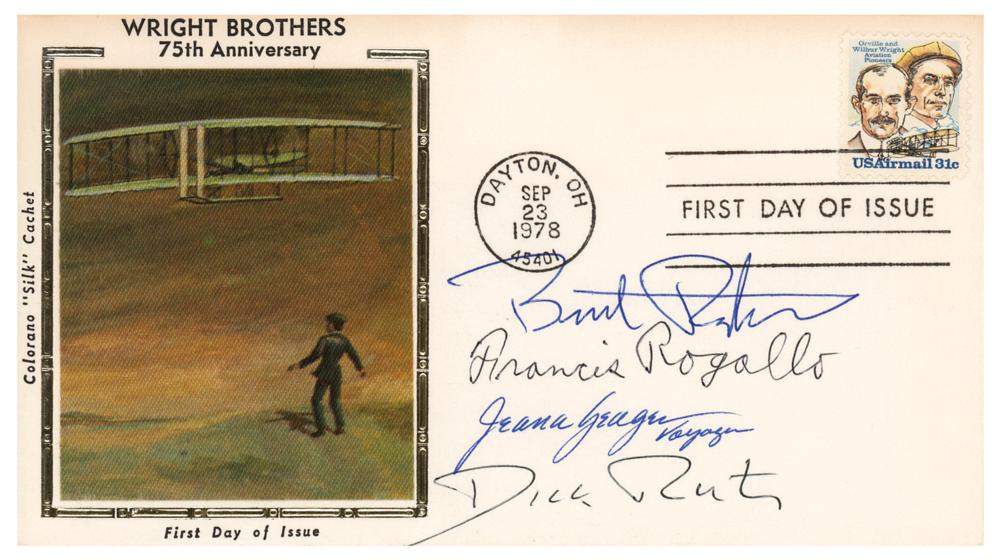 FDC with a Colorano silk cachet honoring the 75th anniversary of the Wright Brothers, signed in blue or black ballpoint by Burt Rutan, the designer of the Voyager aircraft, and Dick Rutan and Jeana Yeager, the pilots of the Voyager non-stop round-the-world flight. The cover is also signed by Francis Rogallo, an American aeronautical engineer inventor who, with his wife, Gertrude, is credited with the invention of the Rogallo wing, or ‘flexible wing,’ a precursor to the modern hang glider and paraglider. In very fine condition.