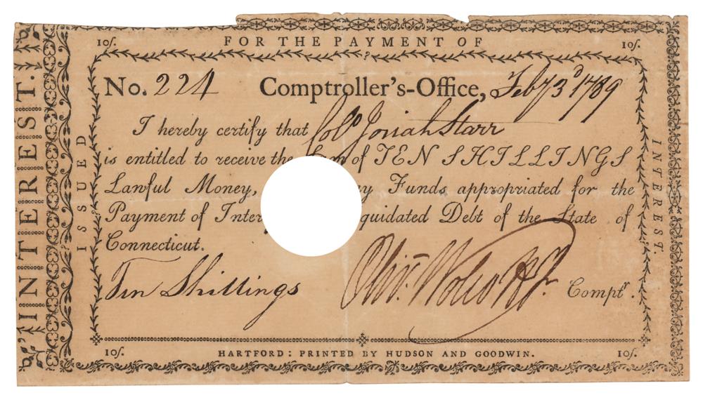 Partly-printed DS, signed “Oliv: Wolcott, Jr.,” one page, 6.5 x 3.5, February 3, 1789. Interest note in the amount of ten shillings, in part: "I hereby certify that Colo Josiah Starr is entitled to receive the Sum of Ten Shillings Lawful Money, [out of an]y Funds appropriated for the Payment of Inter[est on the li]quidated Debt of the State of Connecticut." In fine condition, with a large circular cancellation cut.