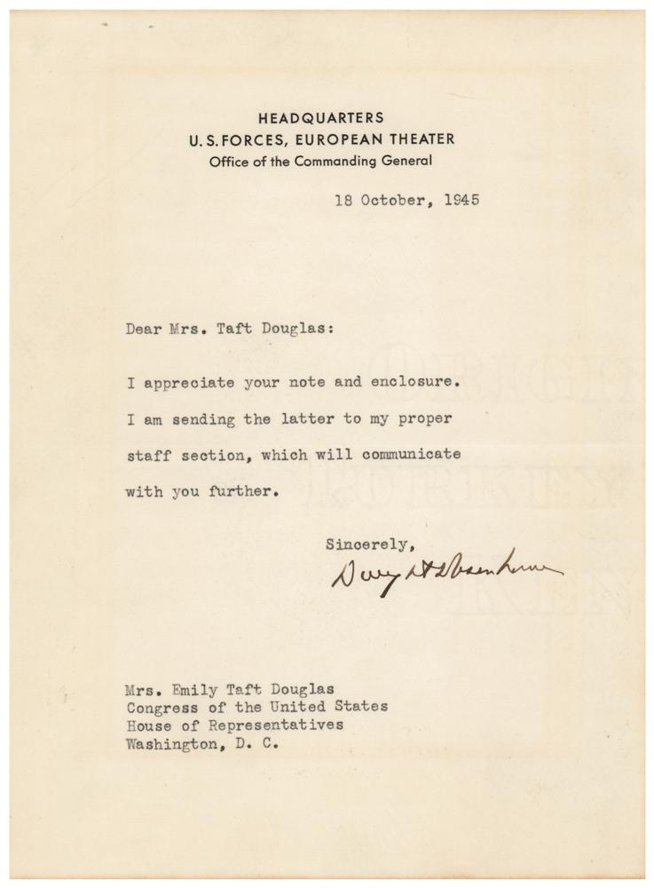 TLS, one page, 6 x 8, personal Headquarters, U.S. Forces, European Theater letterhead, October 18, 1945. Letter to Illinois Congresswoman Emily Taft Douglas, in full: "I appreciate your note and enclosure. I am sending the latter to my proper staff section, which will communicate with you further." In fine condition, with staple holes to the top edge.