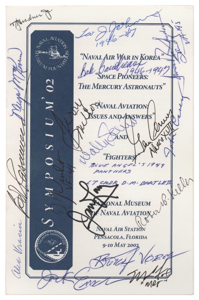 Program for a symposium at the National Museum of Naval Aviation, held at the Naval Air Station, in Pensacola, Florida, on May 9 and 10, 2002, 18 pages, 5.5 x 8.5, signed on the front cover in ink and felt tip by various astronauts and aviators, including: Gene Cernan, James Lovell, Wally Schirra, John Carey, Thomas Hudner, Jr., Robert Keller, James Sanderson, Alex Vraciu, and more. In very fine condition.