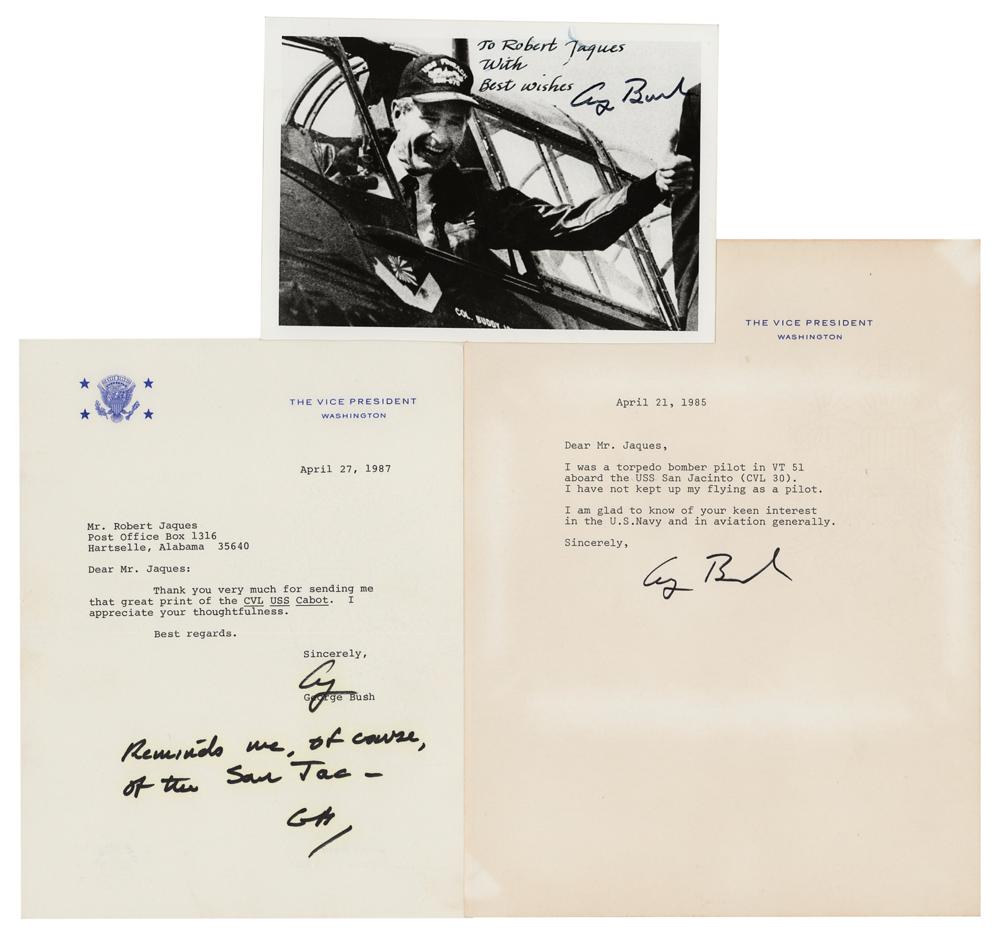 Three items: a TLS as vice president, signed “George Bush,” April 21, 1985, Vice President letterhead, in part: “I was a torpedo bomber pilot in VT 51 aboard the USS Jacinto (CVL 30). I have not kept up my flying as a pilot”; a TLS as vice president, signed “George,” April 27, 1987, Vice President letterhead, in part: “Thank you very much for sending me that great print of the CVL USS Cabot,” with adding his initials to a handwritten postscript: “Reminds me, of course, of the San Jac—GB”; and a glossy 7 x 5 photo of Bush giving a thumb’s up from a cockpit, signed in black felt tip, “George Bush,” with another hand adding an inscription. In overall fine condition, with light haloing to the ink in the 1987 letter.