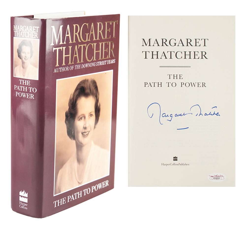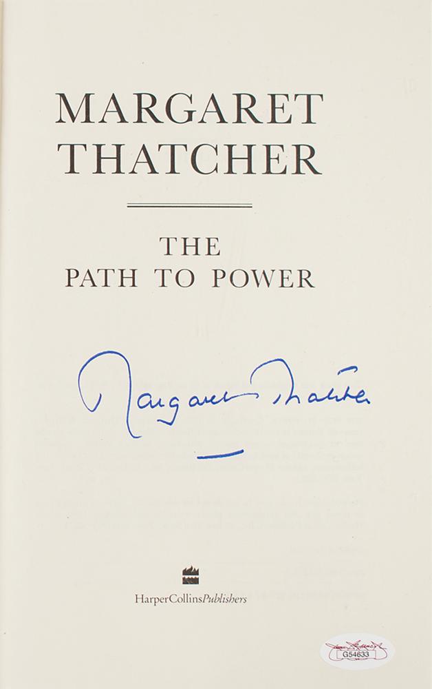 Signed book: The Path to Power. First U.S. edition. NY: HarperCollins, 1995. Hardcover with dust jacket, 6.5 x 9.5, 656 pages. Signed on the title page in blue felt tip by Margaret Thatcher. In fine condition, with a JSA label affixed to the signed page. Accompanied by a certificate of authenticity from JSA.
