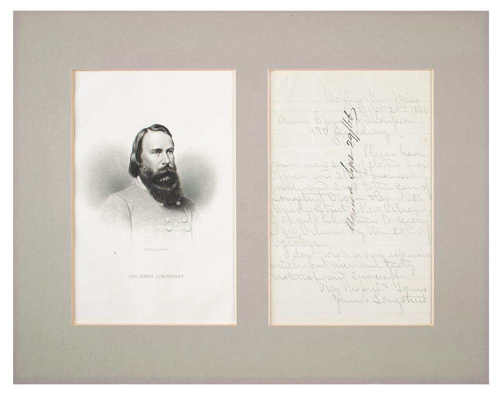 ALS in pencil, one page, 4.75 x 7.5, September 20, 1866. Addressed from Coffeyville, Mississippi, a handwritten letter from Longstreet to New York City tailors Spence and Thompson, in full: "Please have me a nice suit of clothes for office and street business, made and sent to the care of Longstreet Owen & Co. No. 37 Union Street, New Orleans. I should like them to reach New Orleans by the 20th of October. I don't wish a very expensive article but nice and tasty material, and serviceable." Docketing across the center of the letter in ink, "Answ'd Sept. 29/66." Matted with an engraved portrait to an overall size of 14 x 11. In fine condition.