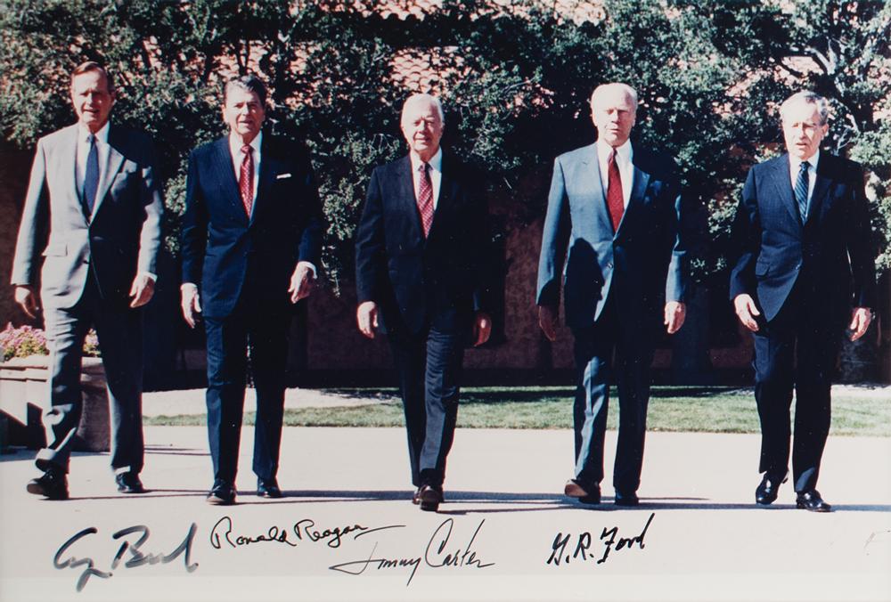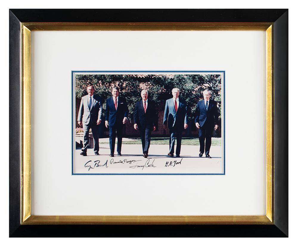 Color glossy 9 x 6.75 photo of American Presidents George Bush, Ronald Reagan, Jimmy Carter, Gerald Ford, and Richard Nixon walking together at the dedication of the Ronald Reagan Presidential Library, signed by all five in the lower border in black felt tip, with Nixon's faded signature only visible at an angle via its pen impressions. Double-matted and framed to an overall size of 18.5 x 15.2.5. In fine condition.