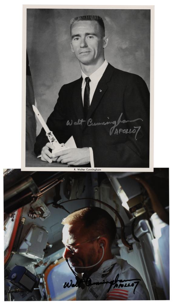 Two photos: an official 8 x 10 NASA Lithograph of Cunningham posing with a rocket model, signed in silver ink, "Walt Cunningham, Apollo 7"; and a color satin-finish 10 x 8 photo of Cunningham inside the Apollo 7 spacecraft, signed in black felt tip, "Walt Cunningham, Apollo 7." In overall very fine condition.