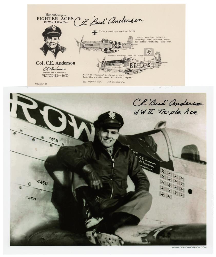 Two items: a lossy 10 x 8 photo of Anderson with his fighter plane, signed in black felt tip, "C. E. 'Bud' Anderson, WWII Triple Ace"; and a specially imprinted 'Fighter Aces of World War II' card, 7.5 x 4, signed in black felt tip, "C. E. 'Bud' Anderson." In overall very fine condition.
