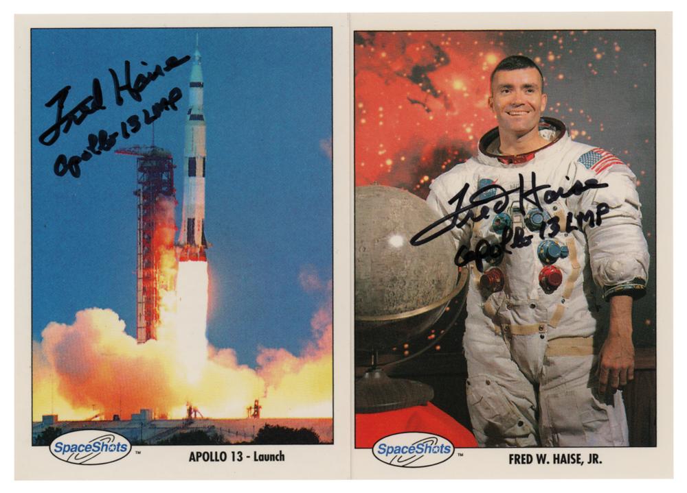 Two SpaceShots trading cards—one of the Apollo 13 launch and one of Haise in his white space suit—both signed in black felt tip, "Fred Haise, Apollo 13 LMP." In overall very fine condition.