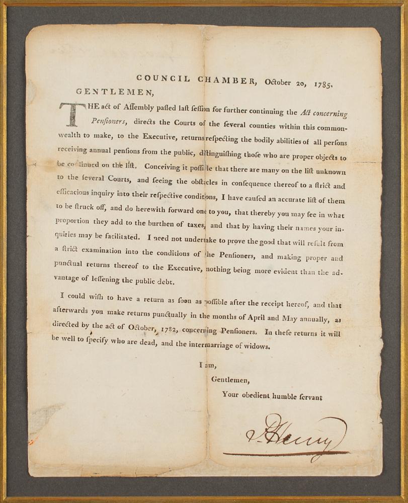 DS as Governor, signed “P. Henry,” one page, 6.5 x 8.25, October 20, 1785. Broadside issued from the Virginia Council Chamber to the clerks of the county courts, respecting the pensions for disabled veterans of the Revolution. In part: "The act of Assembly passed last session for further continuing the 'Act concerning Pensioners,' directs the Courts of the several counties within this commonwealth to make, to the Executive, returns respecting the bodily abilities of all persons receiving annual pensions from the public, those who are proper objects to be continued on the list. Conceiving it possible that there are many on the list unknown to the several Courts, and seeing the obstacles in consequence thereof to a strict and efficacious inquiry into their respective conditions, I have caused an accurate list of them to be struck off, and do herewith forward one to you, that thereby you may see in what proportion they add to the burthen of taxes, and that by having their names your inquiries may be facilitated. I need not undertake to prove the good that will result from a strict examination into the conditions of the Pensioners, and making proper and punctual returns thereof to the Executive, nothing being more evident than the advantage of lessening the public debt. I could wish to have a return as soon as possible after the receipt hereof, and that afterwards you make returns punctually in months of April and May annually, as directed by the act of October, 1782, concerning Pensioners. In these returns it will be well to specify who are dead, and the intermarriage of widows." Boldly signed at the conclusion by Governor Patrick Henry. Archivally mounted, matted, and framed under Tru-Vue Museum Glass with an engraved portrait to an overall size of 20.25 x 16. In very good to fine condition, with professional repairs (and possible complete backing) to repair areas of paper loss, and of separation to the central vertical fold.