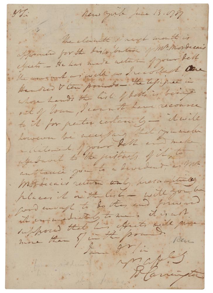 ALS signed "Ed. Carrington," one page, 7.25 x 10.5, June 13, 1787. Edward Carrington, a soldier and statesman from Virginia, writes to "Col. James Monroe, Attorney" to inform him of the repayment of a debt owed by the bankrupt Jacob Mordecai, a noteworthy American-born Jewish businessman and partner of financier Haym Salomon. Carrington writes, in part: "The eleventh of next month is appointed for the distribution of Mr. Mordecai’s effects. He has made return of your debt, the amount as well as I recollect one hundred & ten pounds. The assignee in whose hands the list of debts is being out of Town, I cannot have recourse to it for greater certainty—it will however be necessary that you make allotment of your debt and make affidavit for the justness of it, to [entitle] you to a dividend, as Mr. Mordecai’s return only presumptively places it on the list. Will you be good enough to do this and forward it immediately to me?" Addressed on the integral leaf to Monroe by Carrington, and franked "Free, Ed. Carrington" at the bottom; docketed in Monroe's hand, "June 13, 1787, Col. Carrington." In very good condition, with overall foxing, and adhesive residue stains to the integral address leaf, which also display a repair to seal-related paper loss.