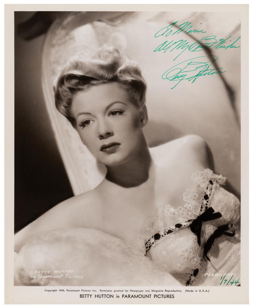 Vintage glossy 8.25 x 10 Paramount Pictures publicity photo of Hutton seated in a lacy floral top, signed and inscribed in green fountain pen, "To Marie, All my best wishes, Betty Hutton.” In fine condition.