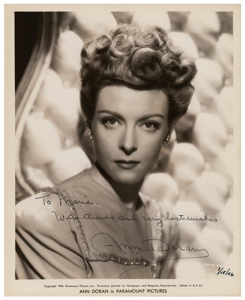 American character actress (1911-2000) who is perhaps best known as the mother of Jim Stark (James Dean) in Rebel Without a Cause. Vintage glossy 8.25 x 10 Paramount Pictures publicity portrait, signed and inscribed in black ink, "To Maria—with thanks and very best wishes, Ann Doran.” Lower right corner is dated to January 15, 1946. In fine condition.